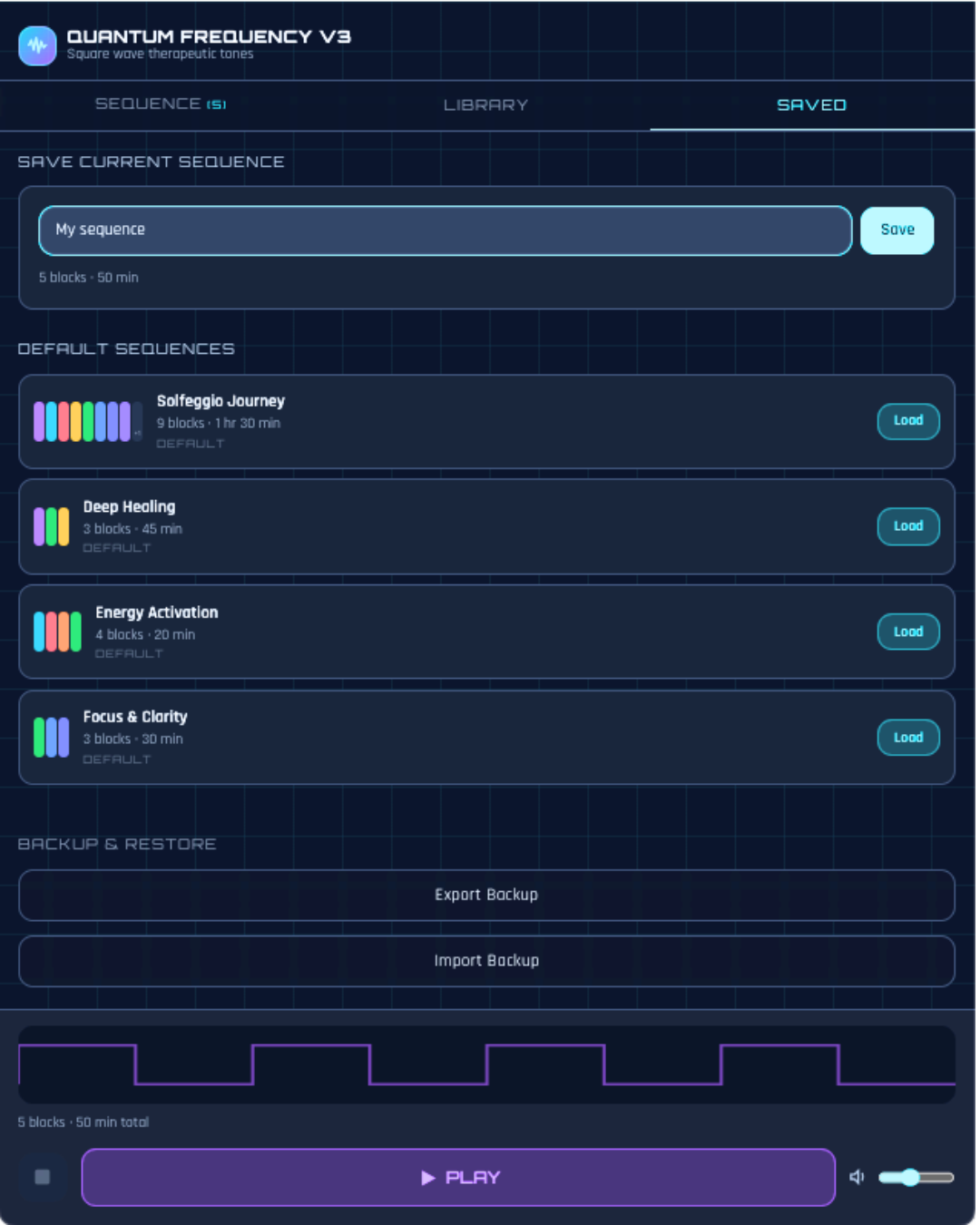 Click to open and then choose a sequence that you have saved previously or create a new one with the default Solfeggio frequencies and/or your own custom frequency. Edit the timings if you like and then hit play and feel the healing/deep relaxation happen. If you like it then be sure to save it for use another time.